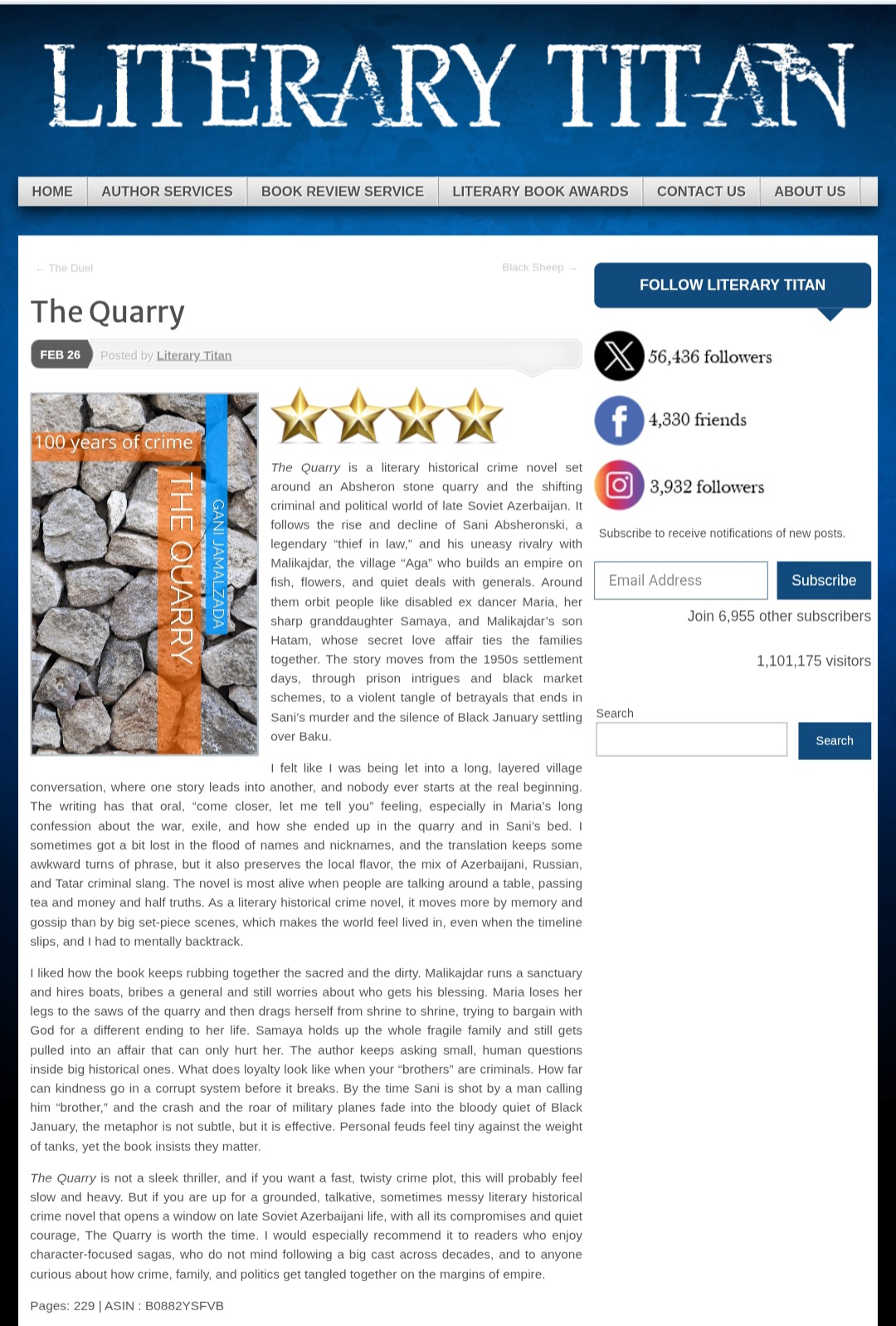 Beynəlxalq platformada yayımlanan resenziyada əsər sovet dövrü Azərbaycanının kriminal və siyasi reallığını çoxqatlı və atmosferik şəkildə əks etdirən ədəbi-tarixi roman kimi qiymətləndirilir. İcmalda vurğulanır ki, hadisələr Abşeron daş karxanası fonunda inkişaf edir və “qanuni oğru” kimi tanınan Sani Abşeronskinin yüksəlişdən faciəvi sonluğa uzanan taleyi üzərində qurulur.